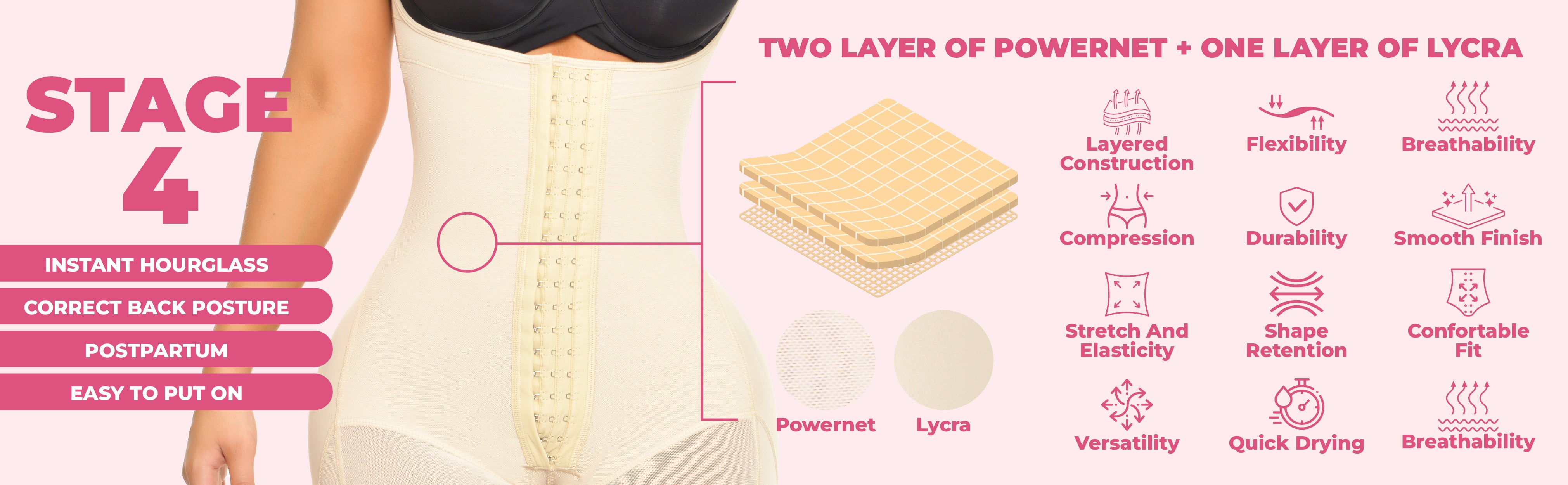 • Fantastic line Shapewear: In this garment, we use 3 layers of Powernet beauty and Trim Shape beauty fabrics, including a  Comfort, which help you get back to your preferred shape after surgery. This garment is perfect to wear after a cosmetic surgery or pregnancy to provide you with high compression to effectively slim down your waist and correct your posture.