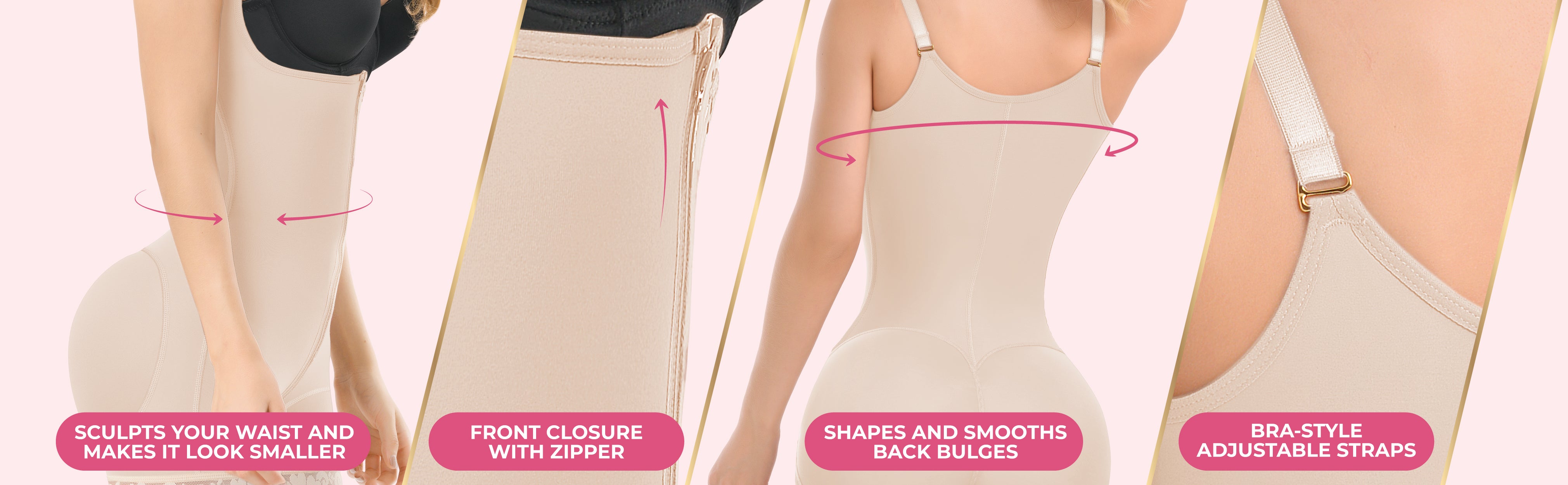 - About the garment: The Ayde body shaper is excellent for everyday use. This mid-thigh length body shaper can reduce inches off your waist, while shaping your body into a slimmer silhouette. It features a u-shaped back style for support, a lace band to prevent it from rolling up, a flat front zipper, adjustable and removable straps, and an internal derriere enhancer. It has frontal latex which provides extra control and abdominal compression.