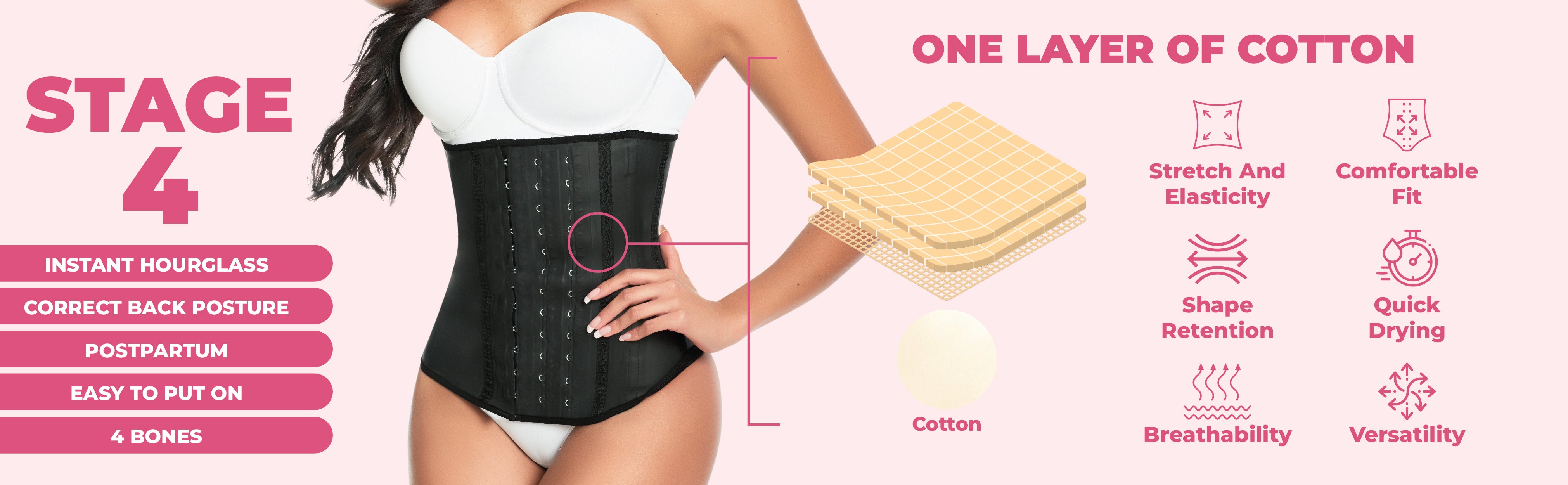 - Latex Garments: Latex will increase the temperature on your abdomen, which will help you sweat more and burn more body fat. The inner layer has been designed to absorb the sweat while working out. If you do not like the smell, leave your waist trainer in a ventilated place to air it out, and the smell will be gone in 3-4 days.