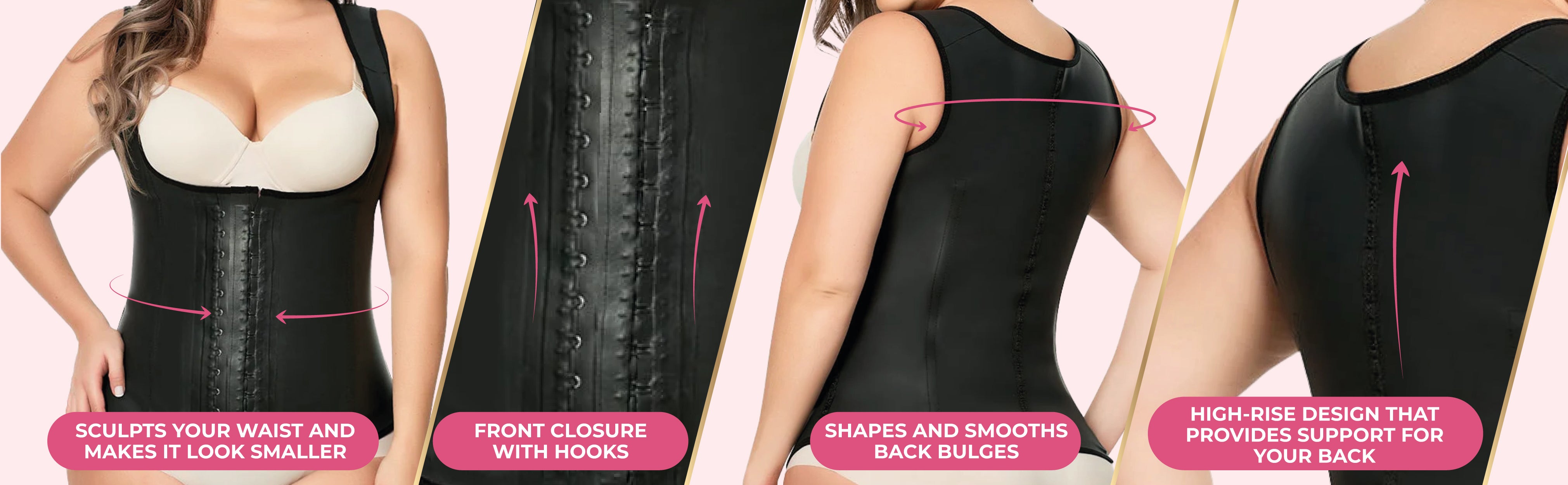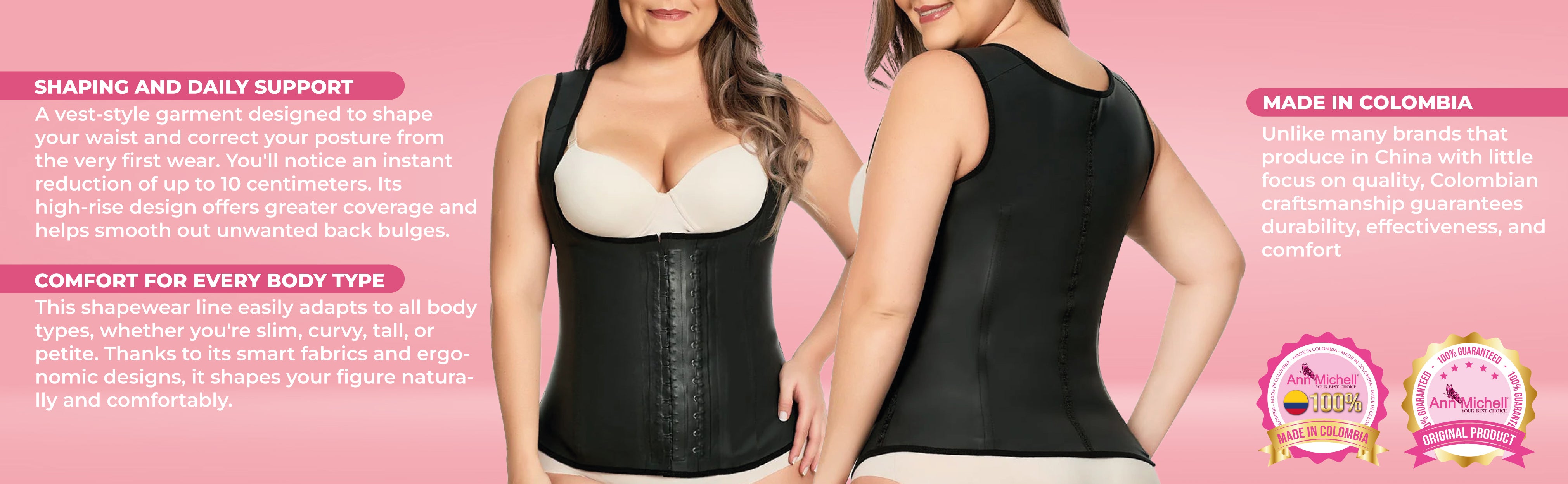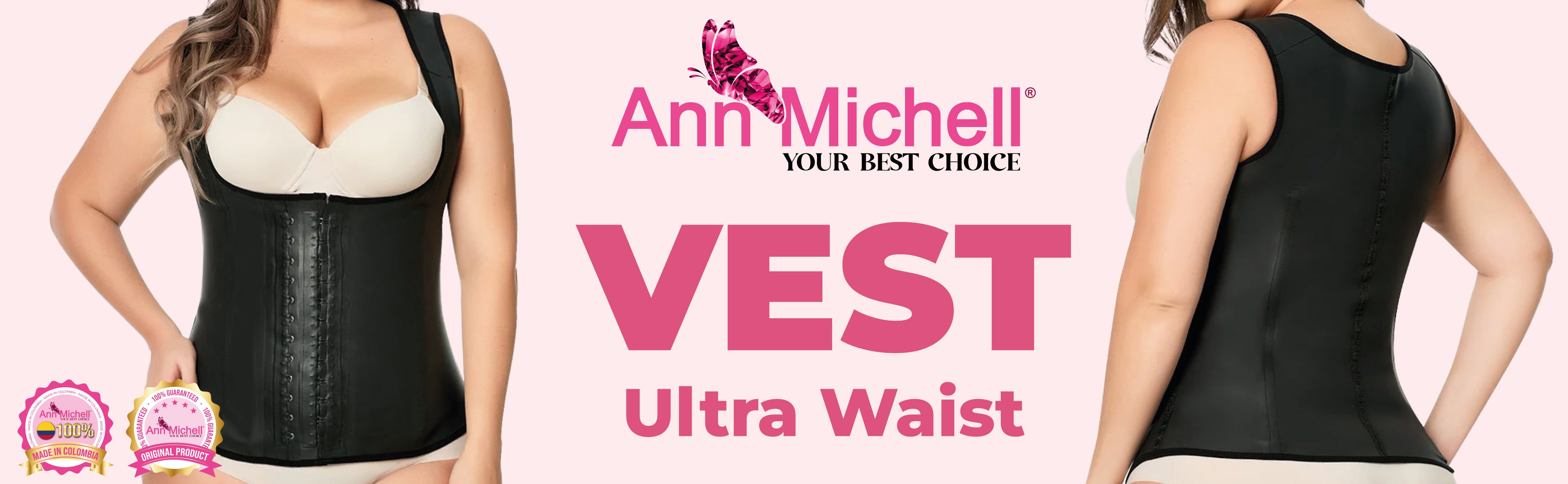 - About this garment: Ann Michell’s latex vest trainer comes with thick straps that provide maximum support for your back and bust. It comes with three hooks and eye closure, that can allow you to increase compression. The vest features the best compression technology that will reduce inches from your abdomen as well as you back. This design also has an open bust, which allows you to wear your own bra.