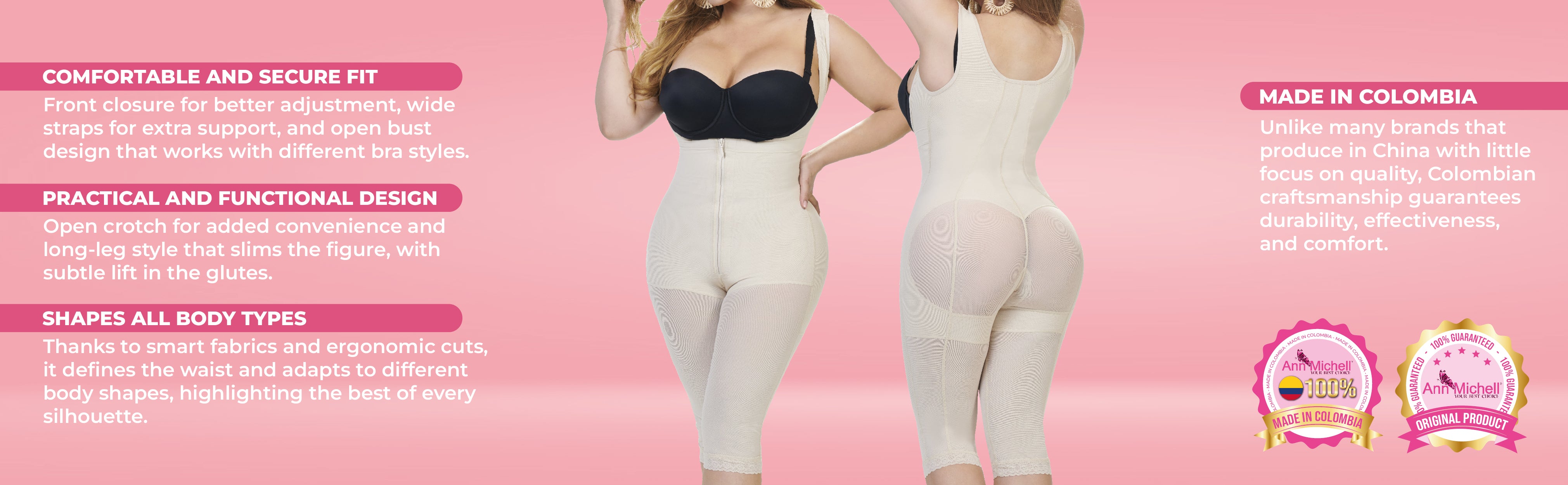 - About the garment: Ann Michell’s Karla full body shaper is meant to control your waist, abdomen, and hips. The knee-length garment features brace shoulder straps for full back coverage and support, a lace band to prevent it rolling up, a flat and unnoticeable front zipper and an internal derriere enhancer. It also features an exclusive design which allow your breasts to be in a free and comfortable position.