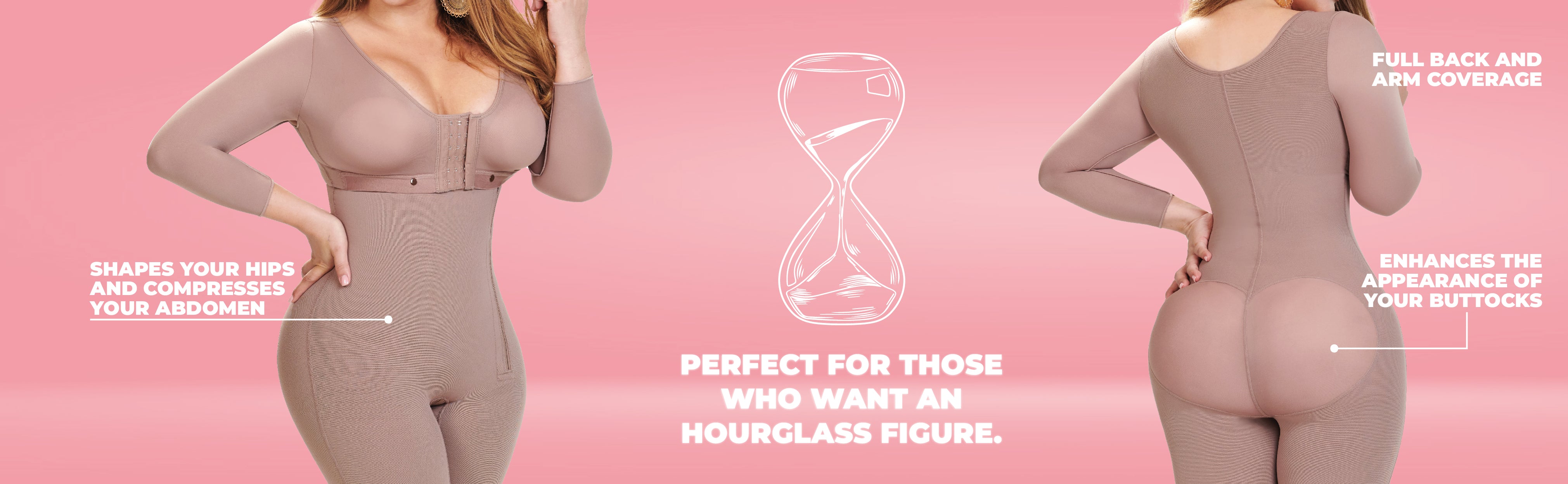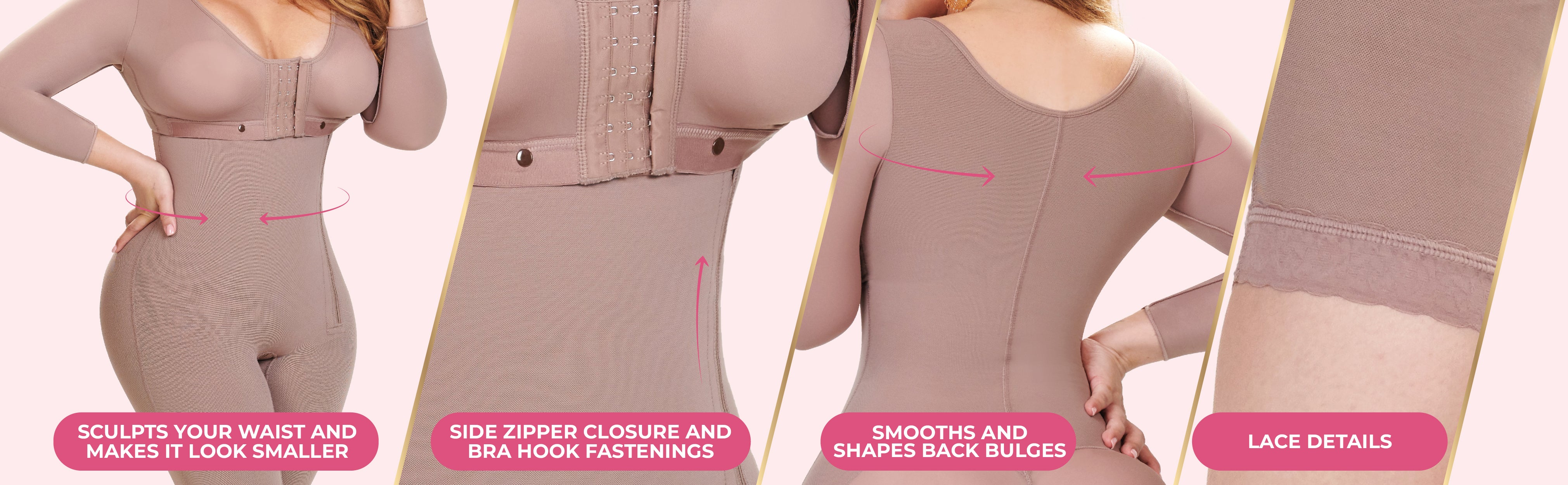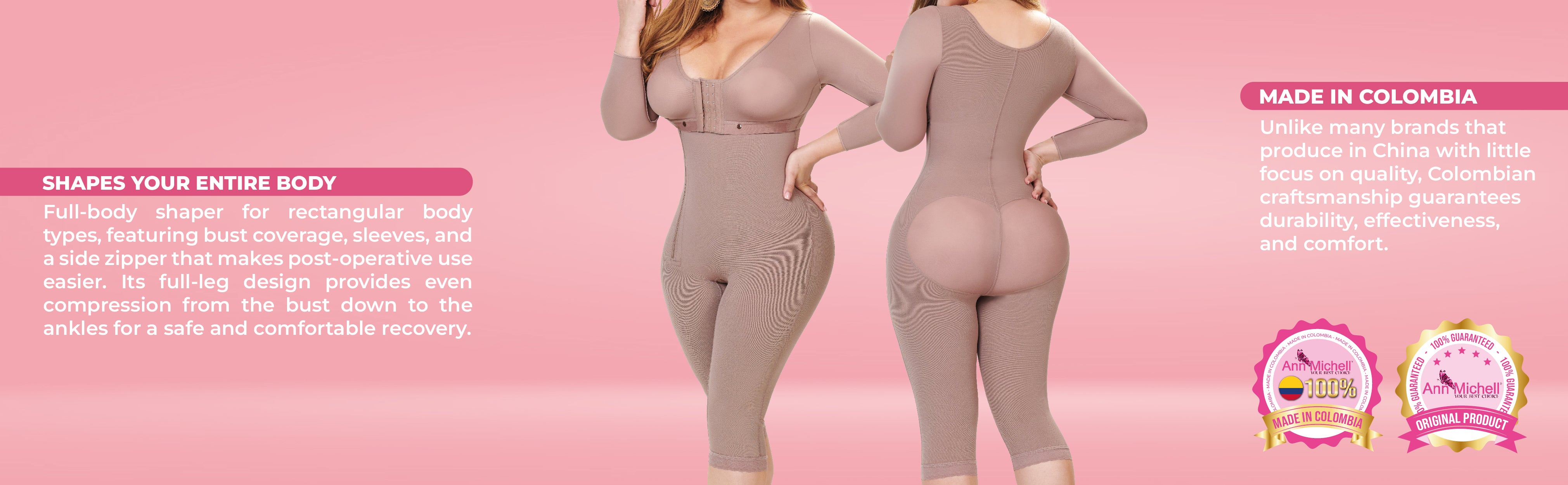 - About the garment: The Ann Michell's Sarah knee-length body shaper is designed to control and smooth the abdomen, tummy, and waist without discomfort. This full body shaper can reduce inches off your waist and stomach, while shaping your body into a slimmer silhouette. It comes with sleeves, full back support to help your posture, a bust enhancing bra with hooks to give you support, and an opening crotch zipper to allow you to go to the restroom without worrying about taking off your garment. This garment comes with side zipper for more compression.