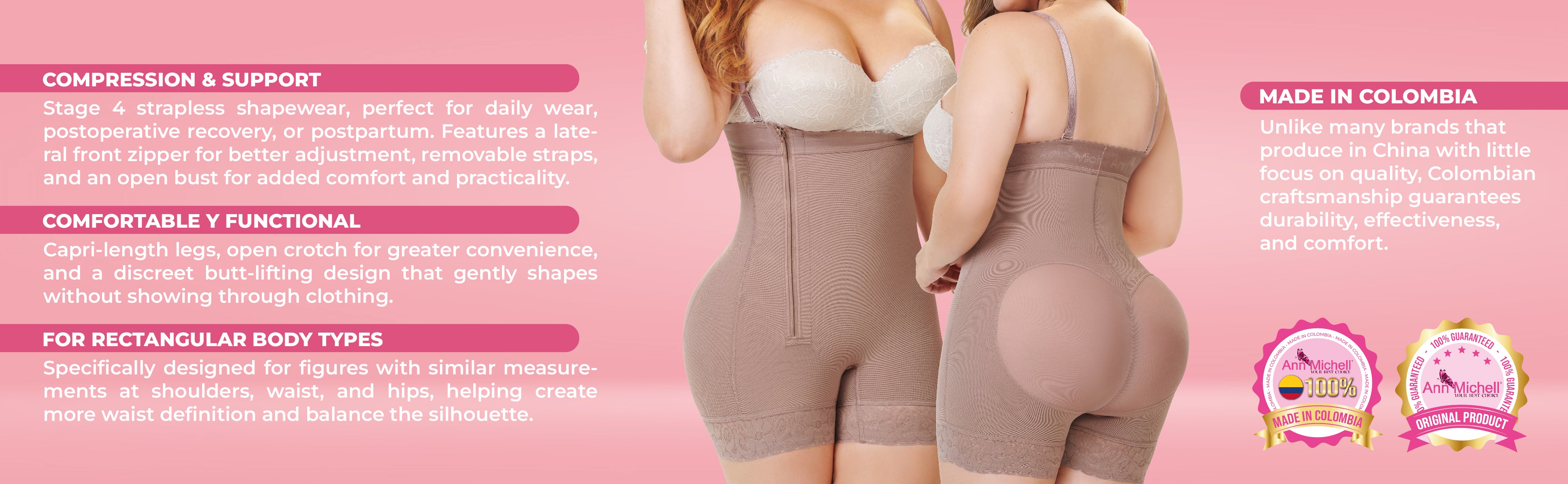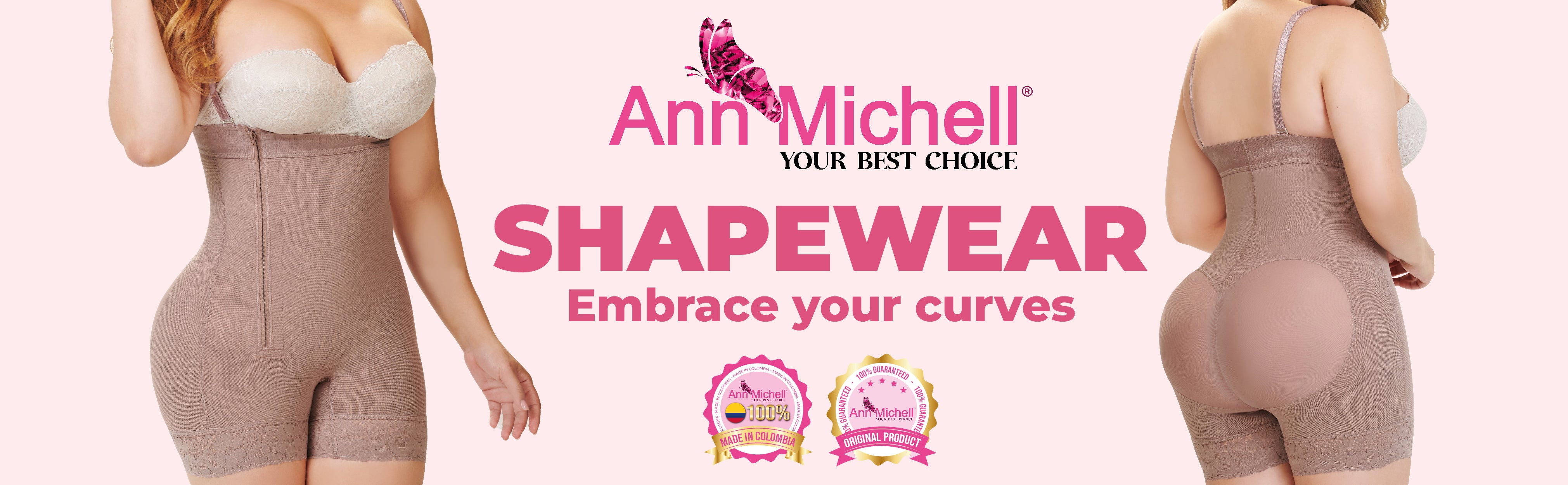 - About the garment: Ann Michell’s Giovanna body shaper has new and innovated mentatex cold firming technology designed to shape and control almost the entire body. This garment is short length garment which features adjustable and removable straps, a flat side zipper for more compression, an inner butt lifter made with lycra, and a silicon lace band to prevent it from rolling up.